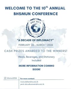 BHSMUN 26 will take place on February 28 and March 1 at Brummana High School, welcoming delegates who are ready to reflect on a decade of diplomatic excellence while contributing to the next chapter of BHSMUN’s legacy.